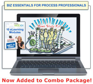 Visual Coach Certification already includes one Business Development Module (near the end of the training phase). However, for Combo Package purchasers, I’m now including Business Essentials for Process Professionals … a thorough 10-Module Home Study Kit.